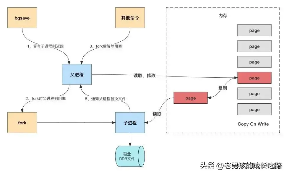 Redis 在持久化是会调用 glibc 的函数(linux系统中最底层的api)fork产生一个子进程,快照持久化完全交给子进程来处理,父进程继续处理客户端请求。子进程刚刚产生时,它和父进程共享内存里面的代码段和数据段,这时可以将父子进程想象成一个连体婴儿,共享身体。这是Linux操作系统的机制,为了节约内存资源,所以尽可能让它们共享起来,在进程分离的一瞬间,内存的增长几乎没有明显的变化。