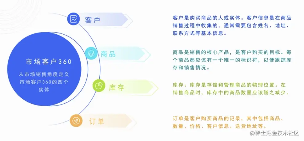 以电商业务为例,先定义一个广义上的市场客户360 的业务主题,在该业务主题下,主要主要包括四个实体——客户、商品、库存和订单。其中,客户是核心实体,与其他三个实体共同配合,最终完成了市场客户销售过程和行为的落地。