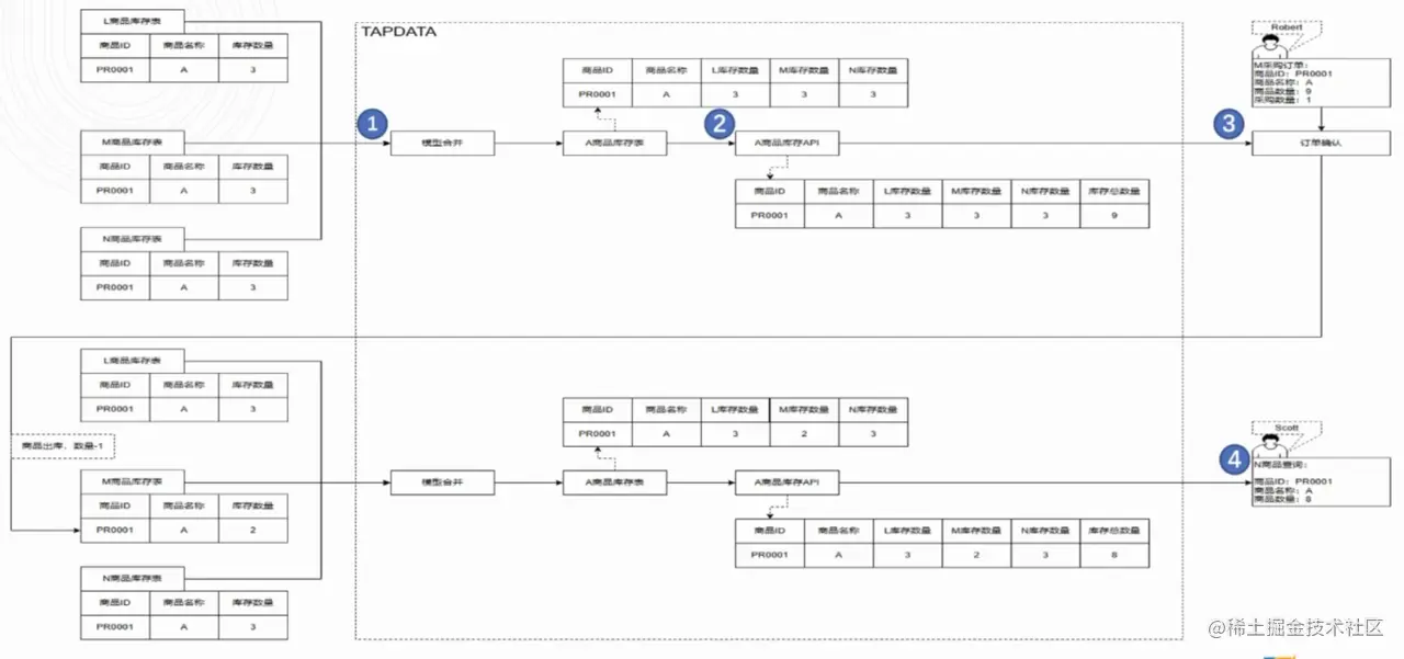 电商 L 的商品分布在自营、M 平台和 N 平台的库存中,而这三个库存都是独立的仓库系统,用户在不同渠道下采购时,需要及时更新并同步相关商品的库存数量。如果现在 M 平台的用户 Robert 在平台上下单采购 1 件商品 A,他看到的库存总数应该是这三方的库存数量的总和,而在他提交订单后,商品 A 库存总数 -1 的同时,变化后的库存总数会实时更新到各系统,同时体现在 M 平台和 N 平台上。此时 N 平台用户 Scott 如果打开商品 A 的查询页,显示的库存总数应该是更新后的数量,即与 M 平台一致,这也是该场景的核心点。