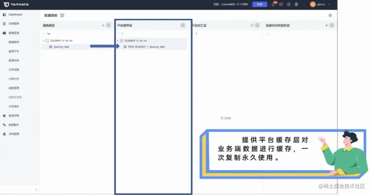 其三, LDP 专门提供了一个数据缓存层,也就是上图中显示的“平台缓存层”,对业务端的数据进行缓存。该缓存层的概念类似于数仓建设过程中的 ODS。将业务数据在平台测以 1:1 的方式缓存一份,做到一次复制,永久使用。