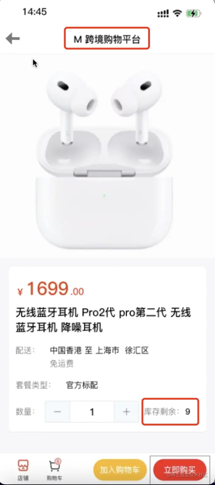 先在 M 平台上,查询到某款蓝牙耳机的库存剩余量为 9