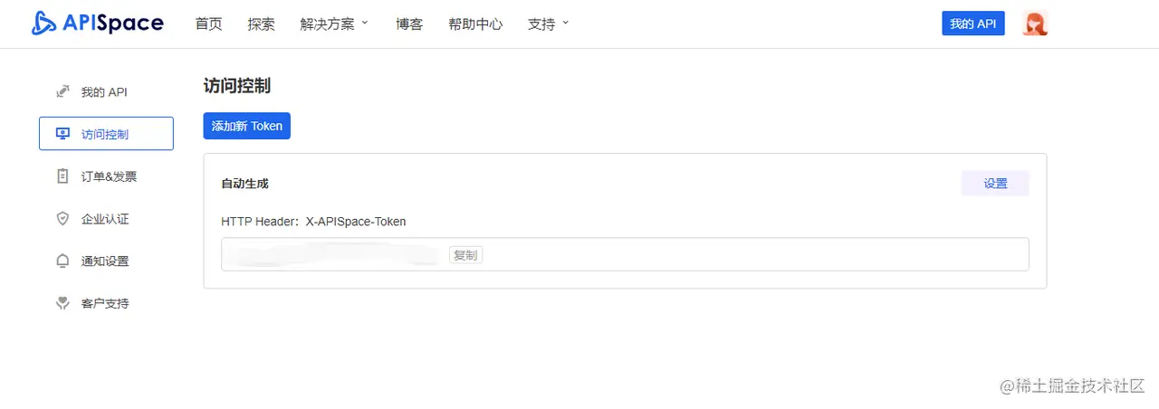 注册成功后,我们在页面导航菜单点击 【我的 API】进入 【访问控制】页面,即可看到平台提供的密钥。