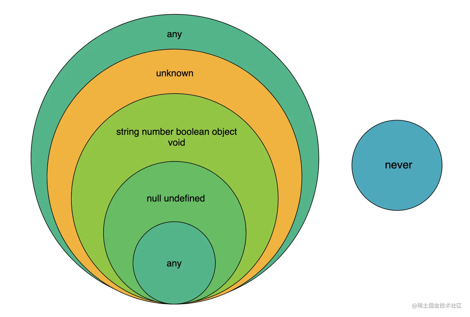 其中any类型是所有类型(除never)的子兼父类型,unknown是所有类型(除never)的父类型,never则为无父子关系的独立类型。