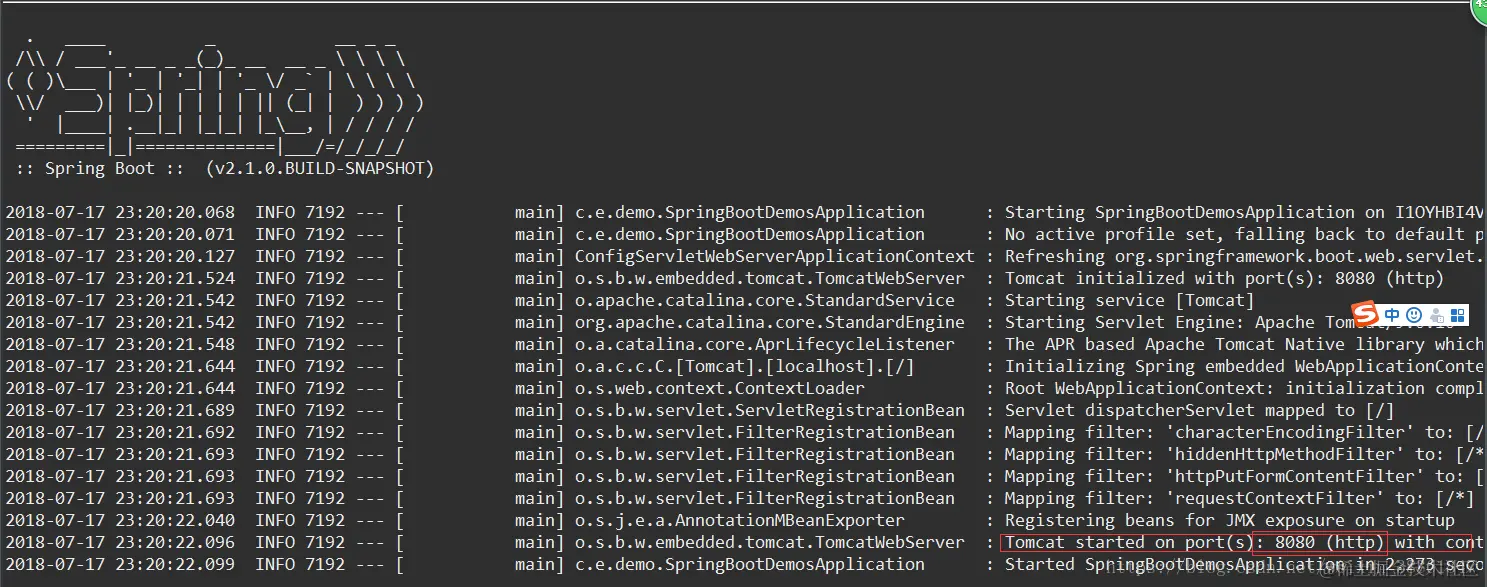 右键运行SpringBootDemosApplication 方法,显示如下则内容说明项目搭建成功。