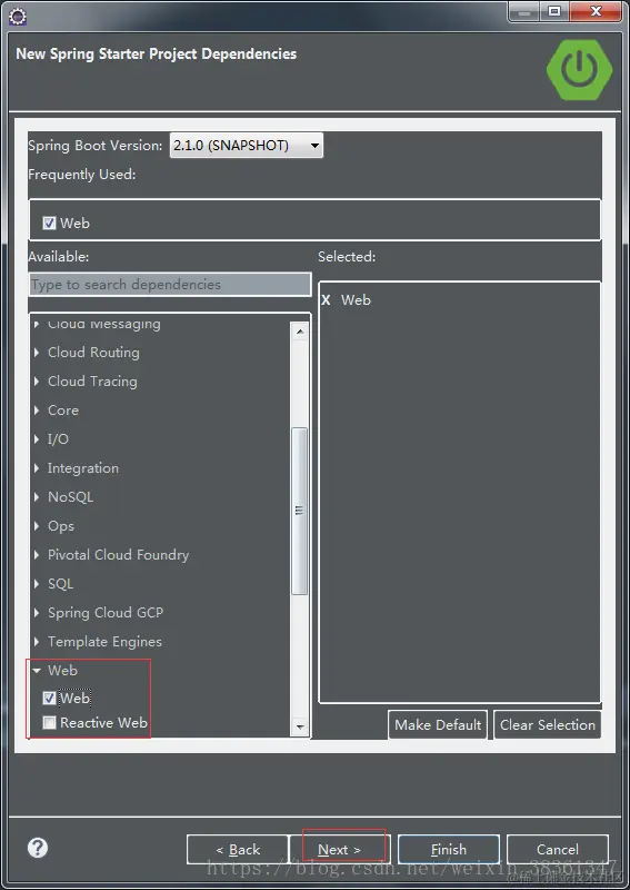 - 第三步 选择web,然后下一步,这里选择的springboot版本是2.1.0(根据个人环境选择)