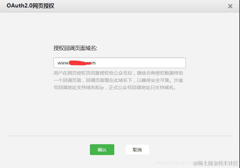 开发者需要先到公众平台官网中的“开发 - 接口权限 - 网页服务 - 网页帐号 - 网页授权获取用户基本信息”的配置选项中,修改授权回调域名。请注意,这里填写的是域名(是一个字符串),而不是URL,因此请勿加 http:// 等协议头;