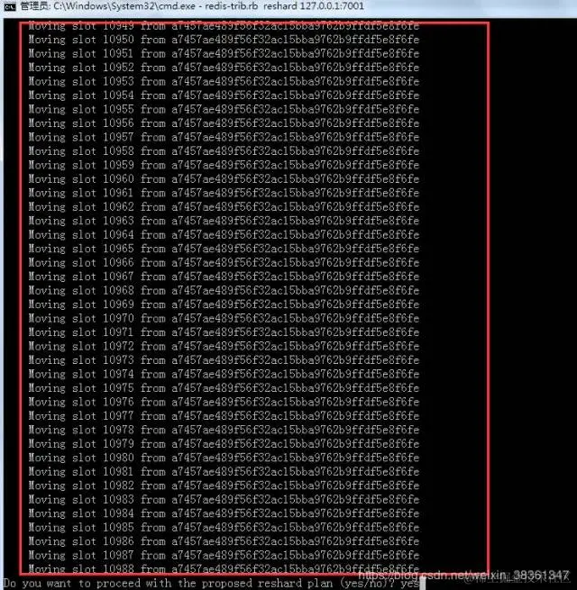 输入 all 表示从所有的主节点中随机转移,凑够200个哈希槽 然后再输入yes,redis集群就开始分配哈希槽了。