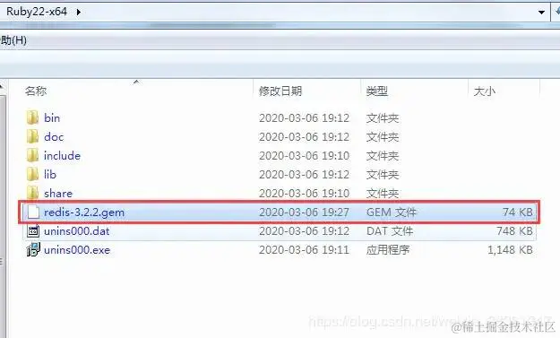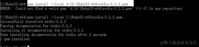 cmd打开命令框 执行命令gem install --local C:\Ruby22-x64\redis-3.2.2.gem 出现以下信息说明配置成功