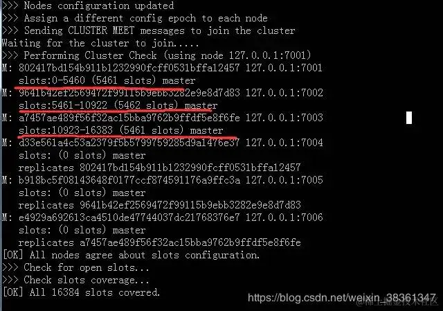 上面启动的脚本创建集群的时候 中途会询问是否打印更多详细信息,输入yes ,然后 redis-trib 就会将这份配置应用到集群当中,让各个节点开始互相通讯。