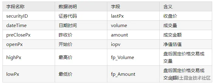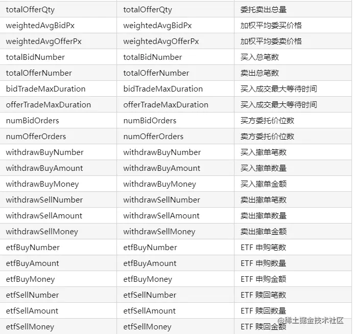 colName = ["securityID","dateTime","preClosePx","openPx","highPx","lowPx","lastPx","totalVolumeTrade","totalValueTrade","instrumentStatus","bidPrice","bidOrderQty","bidNumOrders","bidOrders","offerPrice","offerOrderQty","offerNumOrders","offerOrders","numTrades","iopv","totalBidQty","totalOfferQty","weightedAvgBidPx","weightedAvgOfferPx","totalBidNumber","totalOfferNumber","bidTradeMaxDuration","offerTradeMaxDuration","numBidOrders","numOfferOrders","withdrawBuyNumber","withdrawBuyAmount","withdrawBuyMoney","withdrawSellNumber","withdrawSellAmount","withdrawSellMoney","etfBuyNumber","etfBuyAmount","etfBuyMoney","etfSellNumber","etfSellAmount","etfSellMoney"]