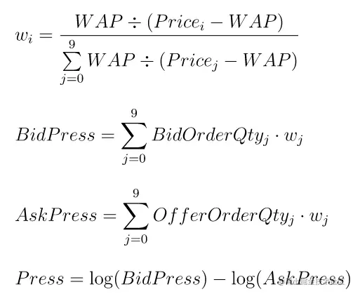 bidPress = wavg(bidOrderQty, wap \ (bidPrice - wap))