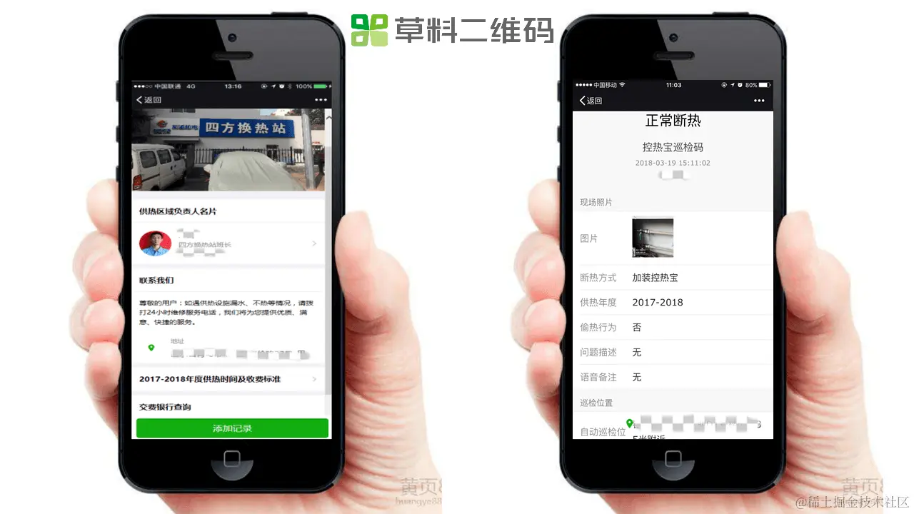 1. 可以进行不同的权限设置: 如用户扫描二维码能够查看到换热站的位置定位、换热站负责人名片、收费通知和交费银行网点查询等信息;巡检人员扫码后跳出来的则是巡检记录的填写界面;