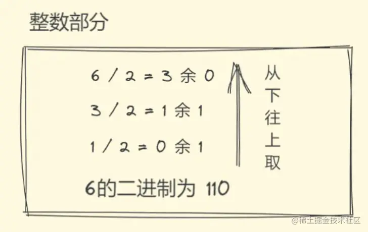 整数部分从1.3 到 1.1 来取,最终将6转换为二进制之后结果为110