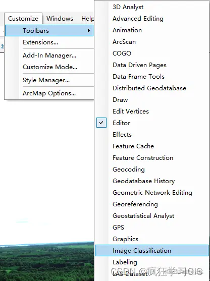 首先,在ArcMap软件上方菜单栏中,我们选择“Customize”→“Toolbars”→“Image Classification”选项。