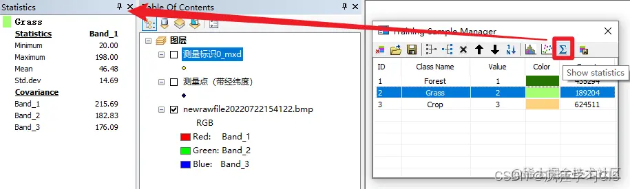 以及可以通过“Show statistics”选项每一种地物类型对应的图像波段数值统计信息。