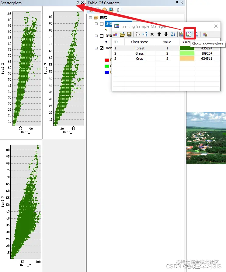 还可以通过“Show scatterplots”选项绘制每一种地物类型对应的图像各波段对应散点图。