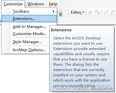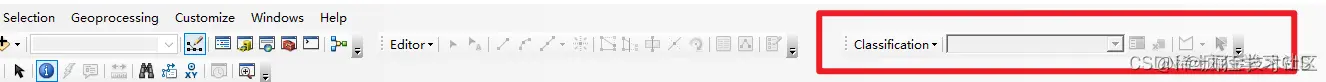 随后,打开需要进行分类的栅格遥感影像图层。这里需要注意,如果打开栅格图层后,遥感影像分类工具栏中各个按钮都是灰色的(如上图所示),那么需要在“Customize”→“Extensions...”中进行以下设置。