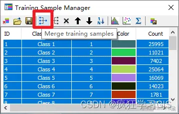 绘制同一地物类型的若干个多边形后,我们首先将这些多边形在“Training Sample Manager”窗口中全选,并通过“Merge training samples”选项,将同一地物类型的多边形合并。
