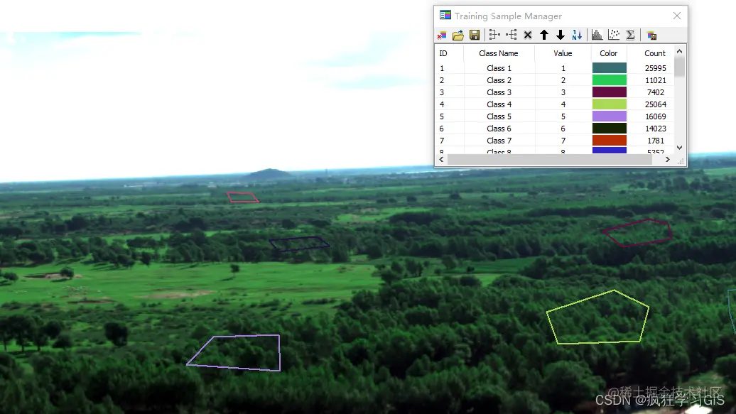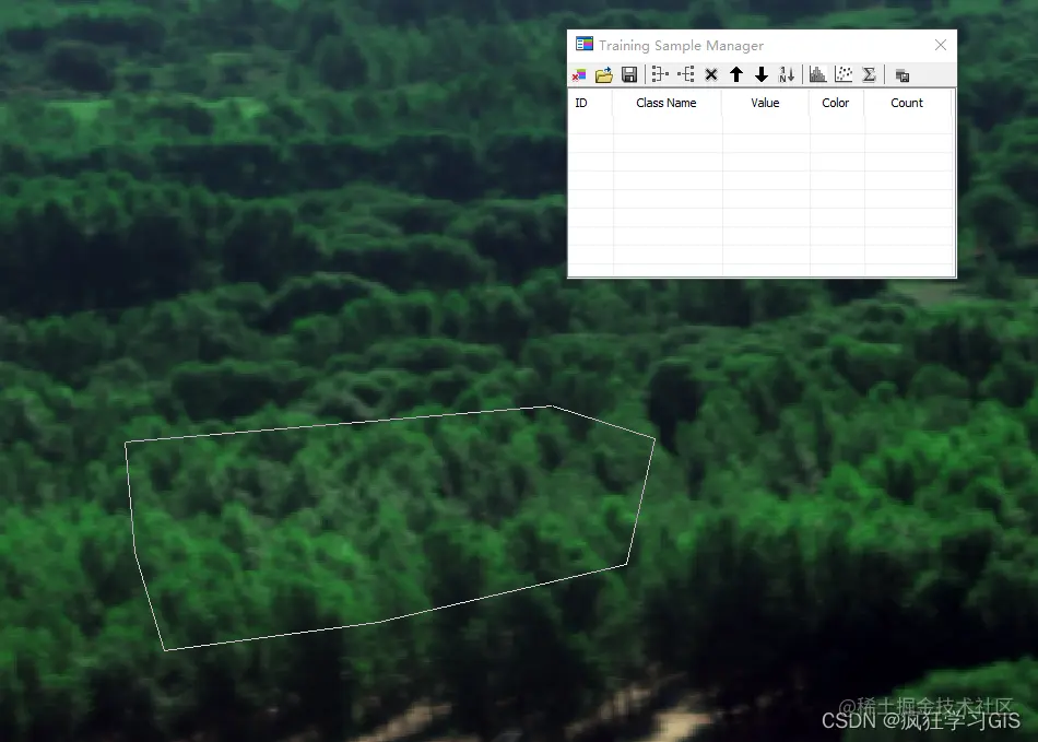 每绘制完毕一个多边形,就会在“Training Sample Manager”窗口中显示一个多边形的信息。我们首先对同一种地物类型绘制多个多边形;如下图所示,我们在图中的森林区域绘制了多个多边形。