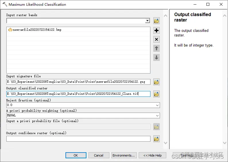 随后,在弹出的“Maximum Likelihood Classification”窗口中配置后需要进行分类的栅格图像文件、前面保存好的.gsg文件,以及输出文件路径与文件名即可;对于剩余的最大似然法分类参数,我们可以选择默认或依据实际情况来修改即可。