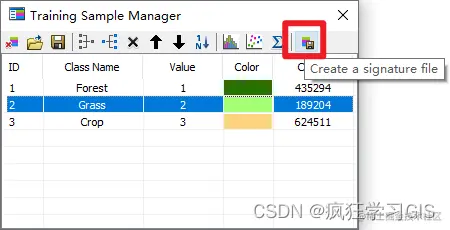 确认各个地物的多边形绘制无误后,我们需要点击“Creat a signatur file”选项,将刚刚划定的各个地物类型多边形区域保存为.gsg文件;这个文件就是我们前面提到的ArcMap软件进行监督分类的输入文件。