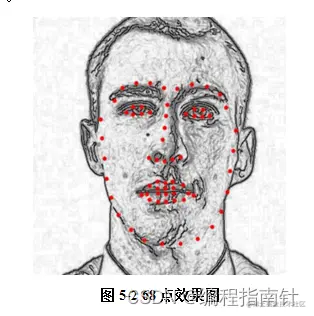 虽然opencv自带的haar和lbp数据模型常用于人脸检测中而且效果更好,但是本系统采用dlib这个目前很常用的c++库包,含有许多关于机器学习的工具接口,在获取人脸关键点的方面上准确率高速度快,而且opencv在检测人脸的时候一旦获取的脸部图像是不是正对面获取的朝向不对就可能检测不出人脸,而dlib很少出现这种情况。因为这个方法采取了级联回归的策略,第一步收集大量经过特殊处理,尺寸大小一致背景一致的人的照片当作训练数据样本,下一步训练获得数据模型。在我们输入一张照片时,dlib会通过它库内的检测器,调用官方训练出来的数据模型,进行匹配,并且把提取到的人脸rets返回,并且调用库接口在返回值上操作面部重要68点标注,然后把68个点的位置信息存在一个参数内,用户可以直接通过此参数了解各个的坐标位置。通过shape即可获得68个特征点(图5.2)。