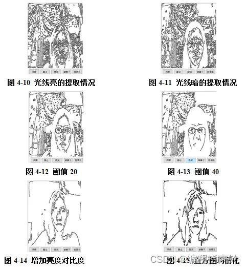 结合上述提到的若干种方法,我们均可在系统内看到直观的视觉效果:由图4-10和图4-11可确定的确在光线暗的时候图像细节丢失较多,而亮的时候图片细节又过多了,很多信息过于繁杂会导致最终的人脸识别效果下降。图4-12和图4-13是改变canny算法的参数阈值而达到的效果,虽然本章为了避免重复介绍canny算法的工作原理并未提及这一方法,但是结合图4-10和4-11,以及图3-5和3-6可知通过调整阈值可以显著的改变边沿对细节方面的描绘,阈值小保留的细节越多,因此在光线亮的时候增大阈值可以排除不必要的细节内容,光线暗的时候减小阈值,尽最大可能的保留细节信息也可以达到自适应的目标。如图4-13,很明显边缘丢失严重应该把阈值调整为20。接下来图4-14就是调整亮度对比度和进行直方图操作图4-15的结果,可以发现经过直方图均衡化之后一些比较强的线条被明显加粗了,但是一些比较轻的线条都被过滤了,因为结合该算法的工作原理可知该算法是直接通过修改图像的像素值使像素值出现次数分布均匀实现的,因此某些出现次数少的像素点会被削弱直接弱化,该方法能有效地对强边缘加强,代价是也会导致一些细节丢失,具有俩面性,但是可以通过调节canny算法的阈值弥补这一缺点。至于直接调整图片亮度从图4-14可见盲目的直接调整图片本身的亮度和对比度会真正的造成细节丢失,所以亮度对图片细节保留的影响指的并不是图片本身的亮度,而可能是外界光等其他因素造成的,