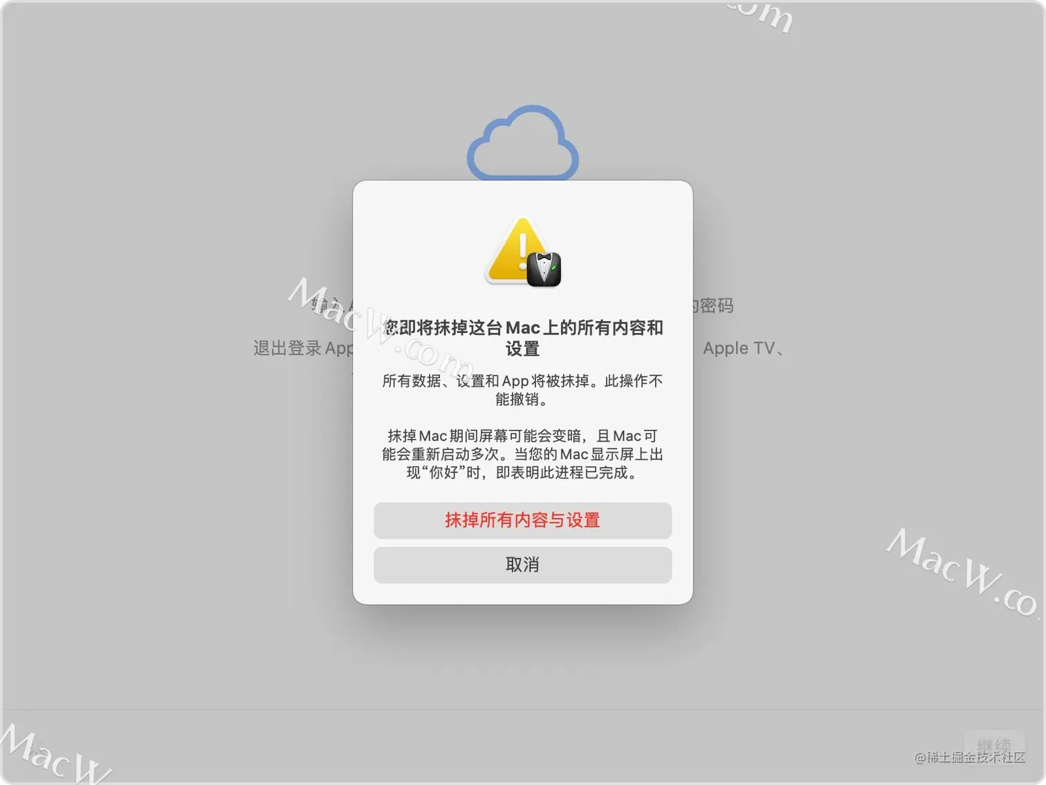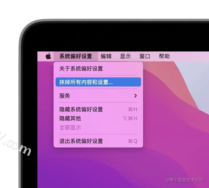 - 在左上角菜单中,选择“抹掉所有内容和设置”,如下图。如果没有这个选项,说明你的Mac不支持这个功能,如图: