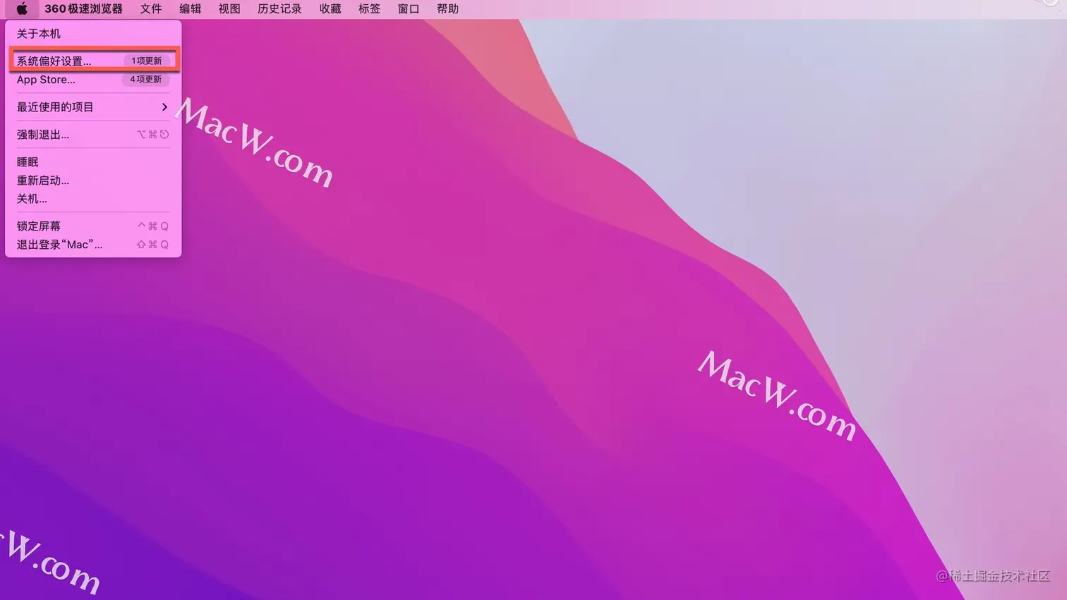 - 打开“系统偏好设置”,可以在左上角点""图标,再选“系统偏好设置”,如图: