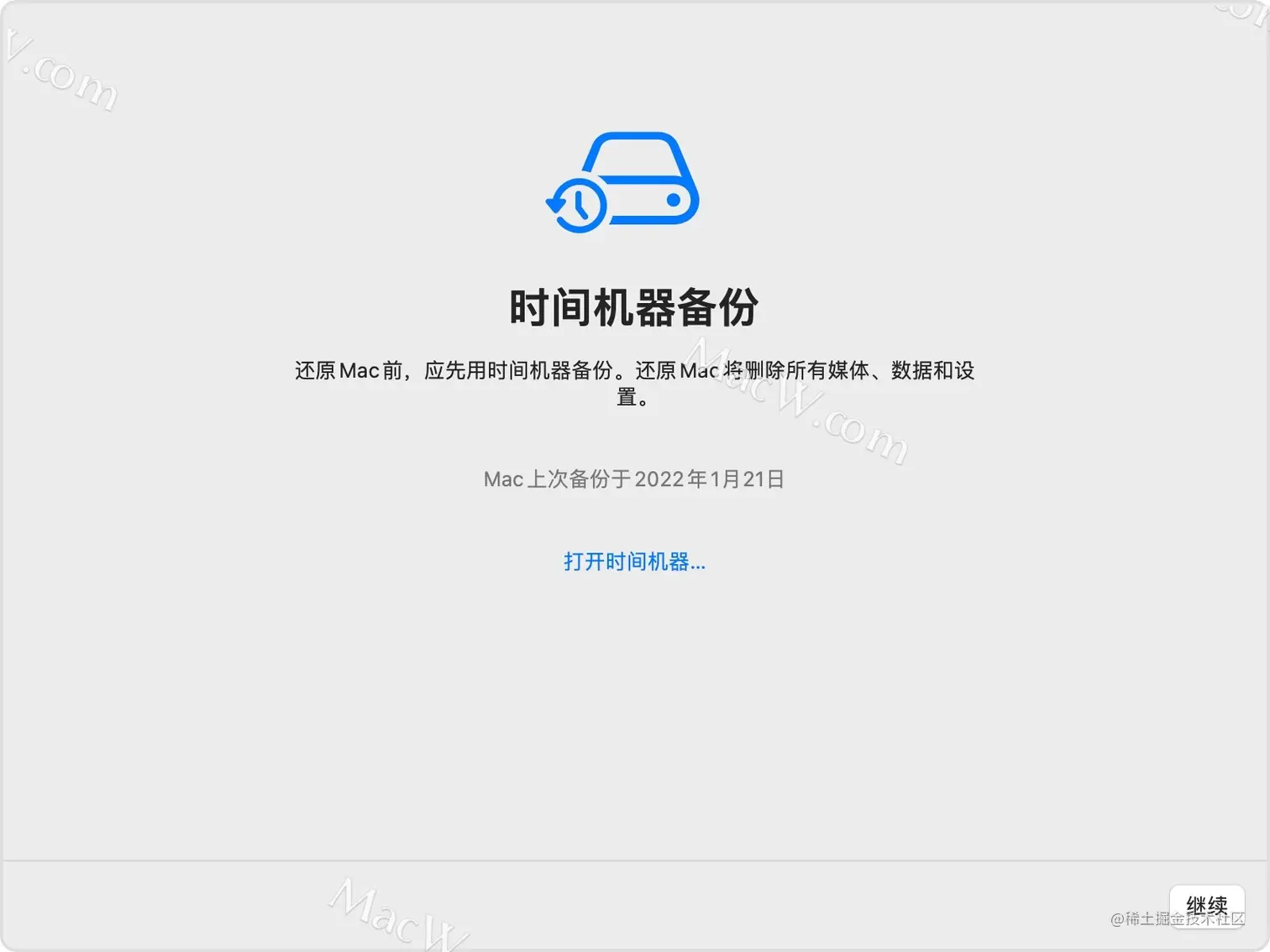 - 之后,系统会提示你使用时光机器进行备份,如果没有必要备份就选择“跳过”即可,如图: