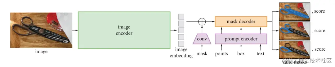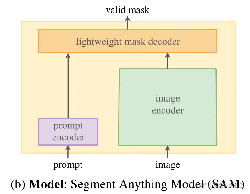如下图所示,SAM 结构简单,包括一个图像编码器,一个 prompt 编码器和一个轻量级的解码器。