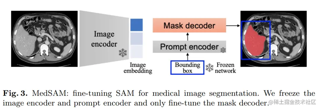 MedSAM 选择微调掩码解码器组件。图像编码器基于 VIT,它在 SAM 中具有最大的计算开销。为了最大限度地降低计算成本,冻结了图像编码器。提示编码器对边界框的位置信息进行编码,可以从 SAM 中预先训练的边界框编码器中重复使用,因此也会冻结该组件。其余需要微调的部分是掩码解码器。