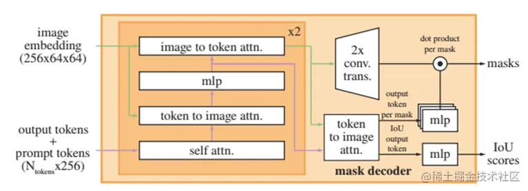 关于 Mask decoder,首先做 prompt 的 self-attention, prompt 到图像 embedding 的 Cross-attention。Cross-attention 是指在有两个相同维度序列的情况下,而其中一个序列用作查询 Q 输入,而另一个序列用作键 K 和值 V 输入。将两个相同维度的嵌入序列不对称地组合在一起。然后,右侧 MLP 均为三层,输出维度与图像 embedding channel 相同的向量,左侧 MLP 为 2048 个神经元,主要作用为聚合全局特征。使用 MLP 更新 token,再做图像 embedding 到 prompt 的 Cross-attention。经过两轮 decode layer 之后,token 再次与图像 embedding 进行 Cross-attention,output token 作为可训练参数在 decoder 前加入到 prompt 中,分别通过两个 MLP,得到 mask 和 mask 的 IOU。