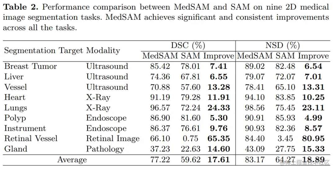 下表是在 2D 的不同模态数据上,MedSAM 和 SAM 的对比结果: