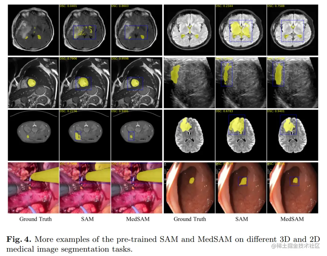 下图分别在 3D 和 2D 数据上做 MedSAM 和 SAM 的分割结果可视化,在同一个 Prompt 下,MedSAM 效果要好很多。