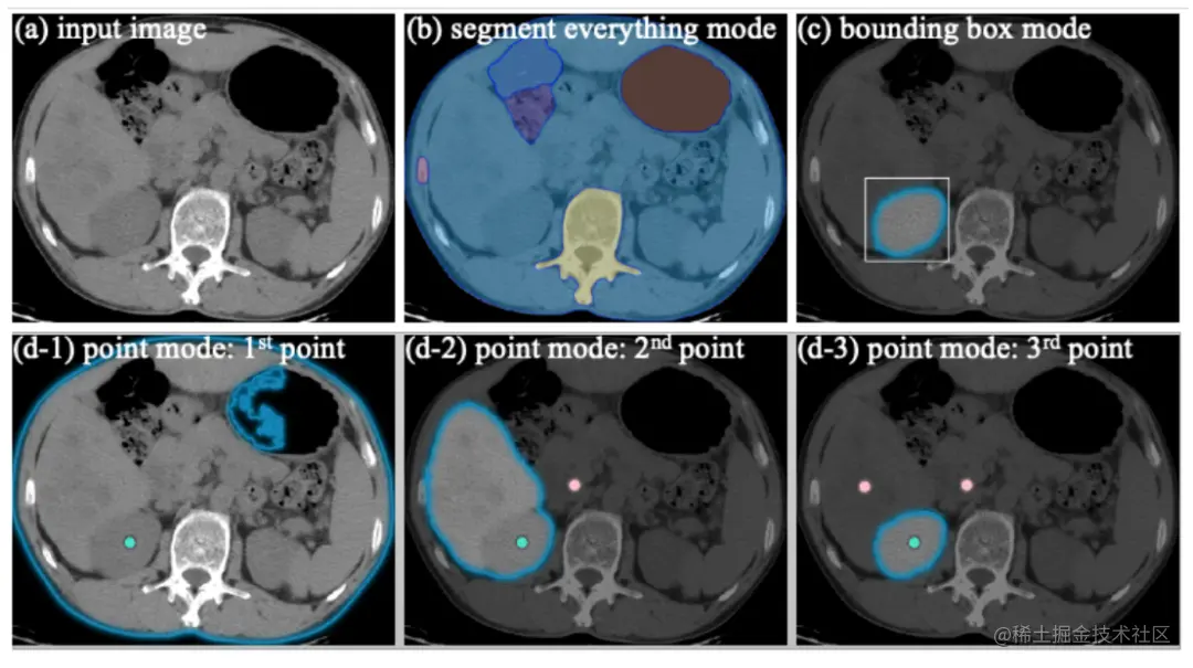 SAM 支持三种主要的分割模式:全自动分割模式、边界框模式和点模式,下图是腹部 CT 在不同 Prompt 下 SAM 的分割结果: