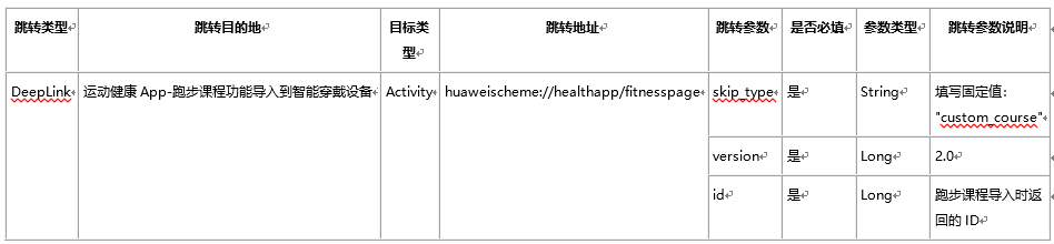 String deeplink="huaweischeme://healthapp/fitnesspage?skip_type=custom_course&id=workoutId&version=2.0";