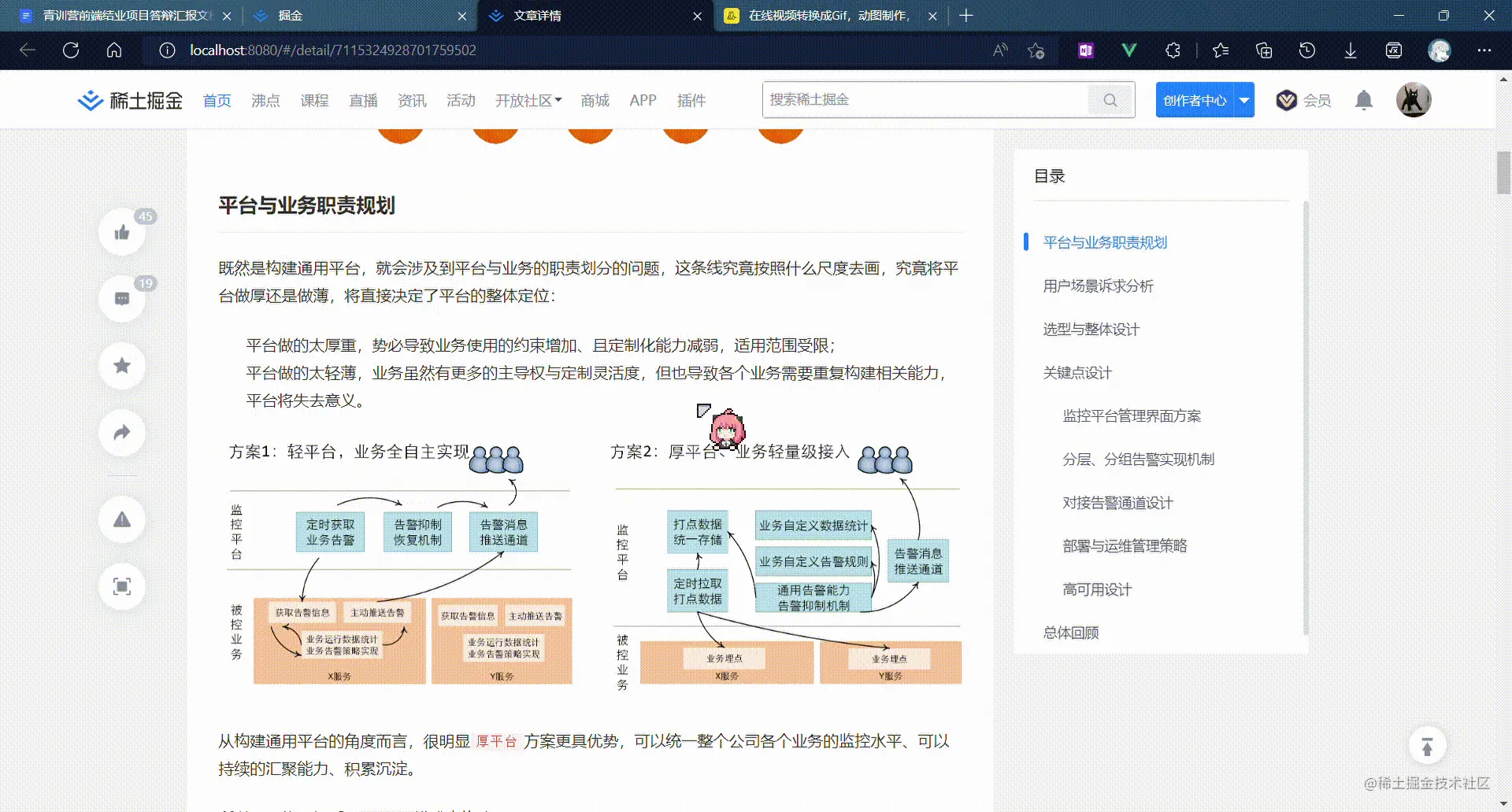 总体来说,就所提的两个主要功能,我们的项目完成度还是挺高的。但是如果想在此基础上继续实现其他功能乃至掘金整个网站,由于前期准备没用沟通好和一些情况没有考虑到,难度还是有的,需要将前期一些代码进行修改。