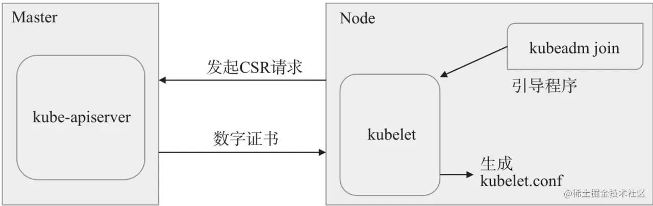 随后,同控制平面建立双向信任关系是新节点加入集群的关键一步,这种双向信任可分为发现和TLS引导程序两个阶段。发现阶段是让新节点通过共享令牌向指定的API Server发送请求以获取集群信息。TLS引导程序阶段是让控制平面借助TLS Bootstrap机制为新节点签发数字证书以信任请求加入的节点,如图2-7所示。
