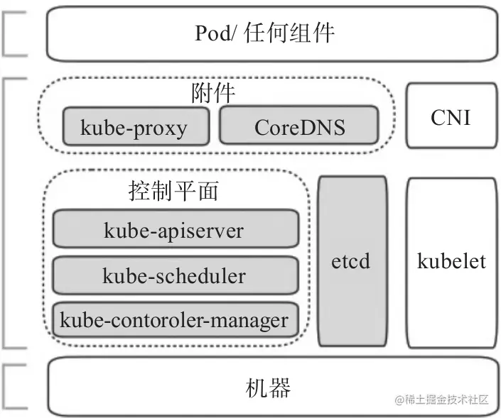 etcd、kube-apiserver、kube-controller-manager、kube-scheduler、kubelet和kube-proxy,这些组件自身也是应用程序,除了kubelet和Docker等容器引擎之外,其他几个组件同样可以运行为容器。