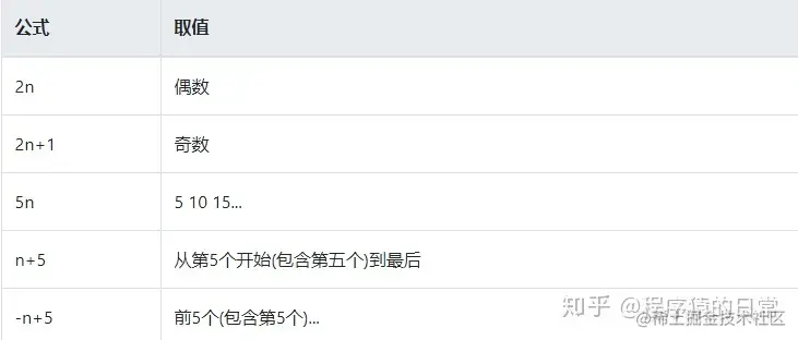 :nth-child(n)匹配属于其父元素的第N个子元素,不论元素的类型even偶数odd奇数,如果用公式n从0开始 (从上往下数) -