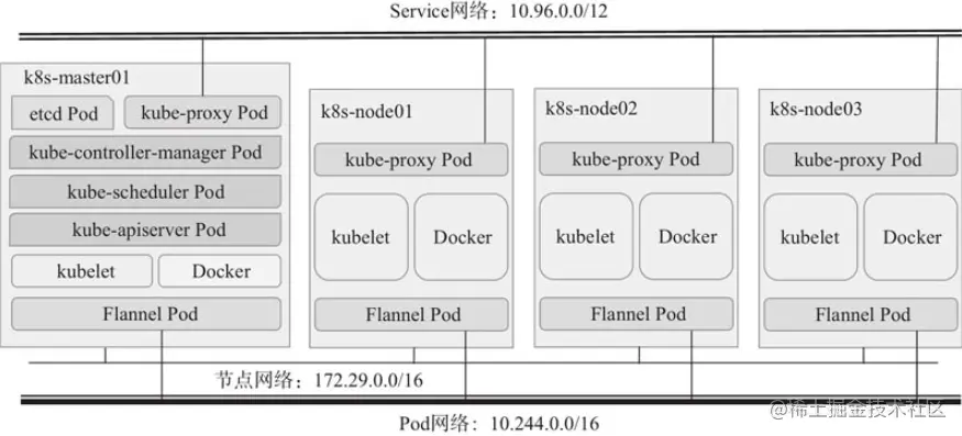 本节将使用kubeadm部署由1个Master主机和3个Node主机组成的Kubernetes集群,用到的各主机分别是k8s-master01、k8s-node01、k8s-node02和k8s-node3,各主机和网络规划等如图2-8所示。