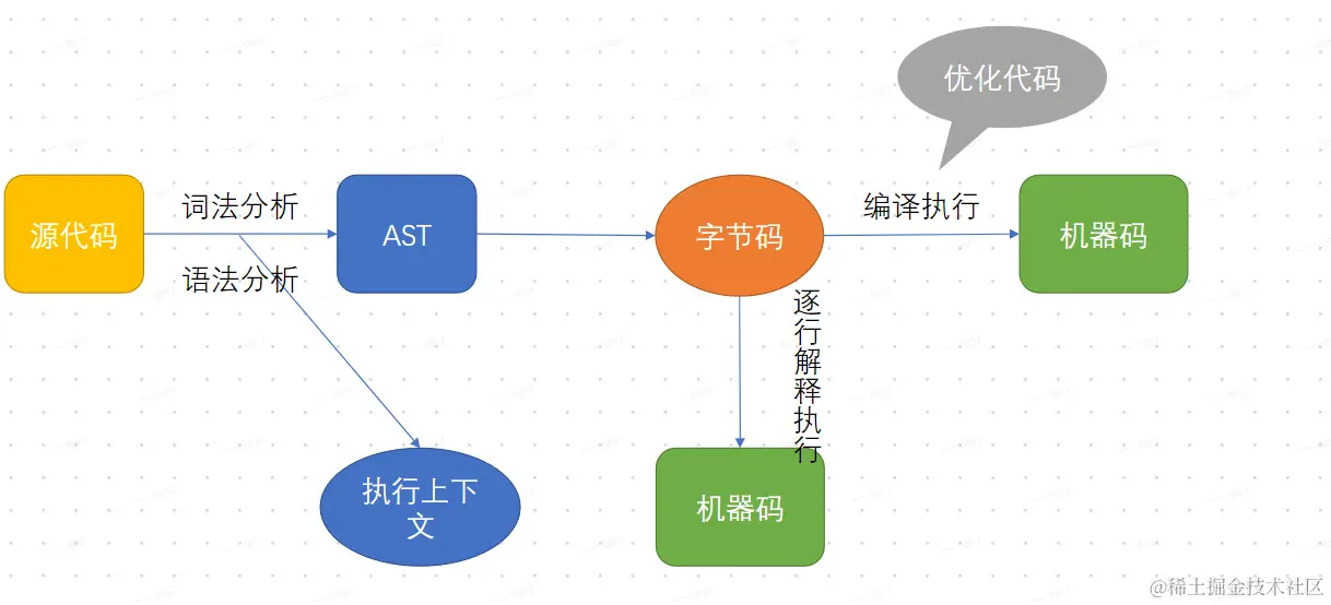 首先对源代码进行词法分析和语法分析生成AST(abstract syntax tree\抽象语法树,抽象表示把js代码进行了结构化的转化,转化为一种类似树状数据结构的json对象),同时创造执行上下文。AST会进一步转换成字节码,字节码通过逐行解释执行生成机器码(类似于高级语言转换成汇编语言)。字节码编译执行生成机器码的过程js会对其进行优化(JIT)。过程如下图所示,相关细节可参考后续的链接。