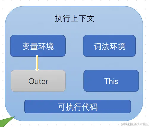 当js引擎解析可执行代码片段(通常是函数调用)时,会仙做准备工作,这个准备工作就是执行上下文。执行上下文中包括变量环境、词法环境、this、可执行代码、Outer(指向外层执行上下文)。