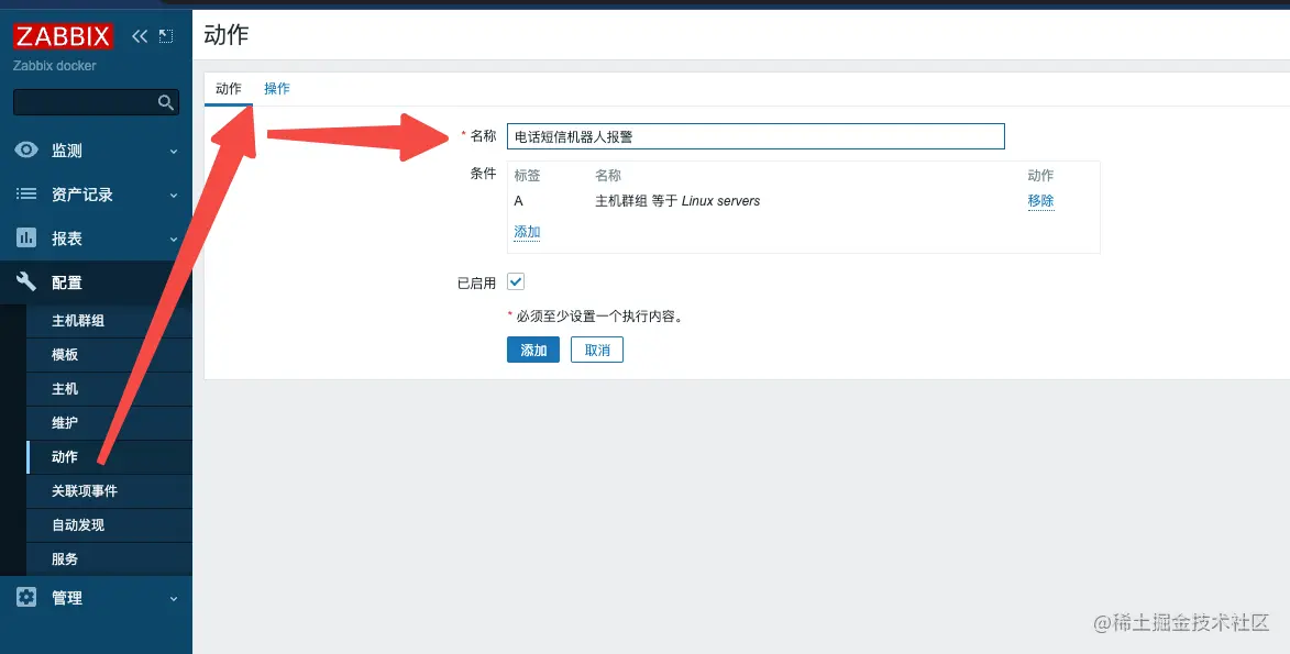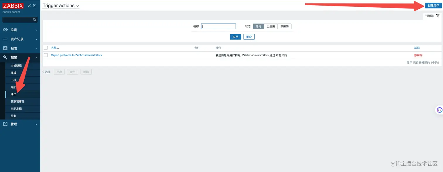 在Zabbix管理界面,点击左侧“配置”,然后选择“动作”。
