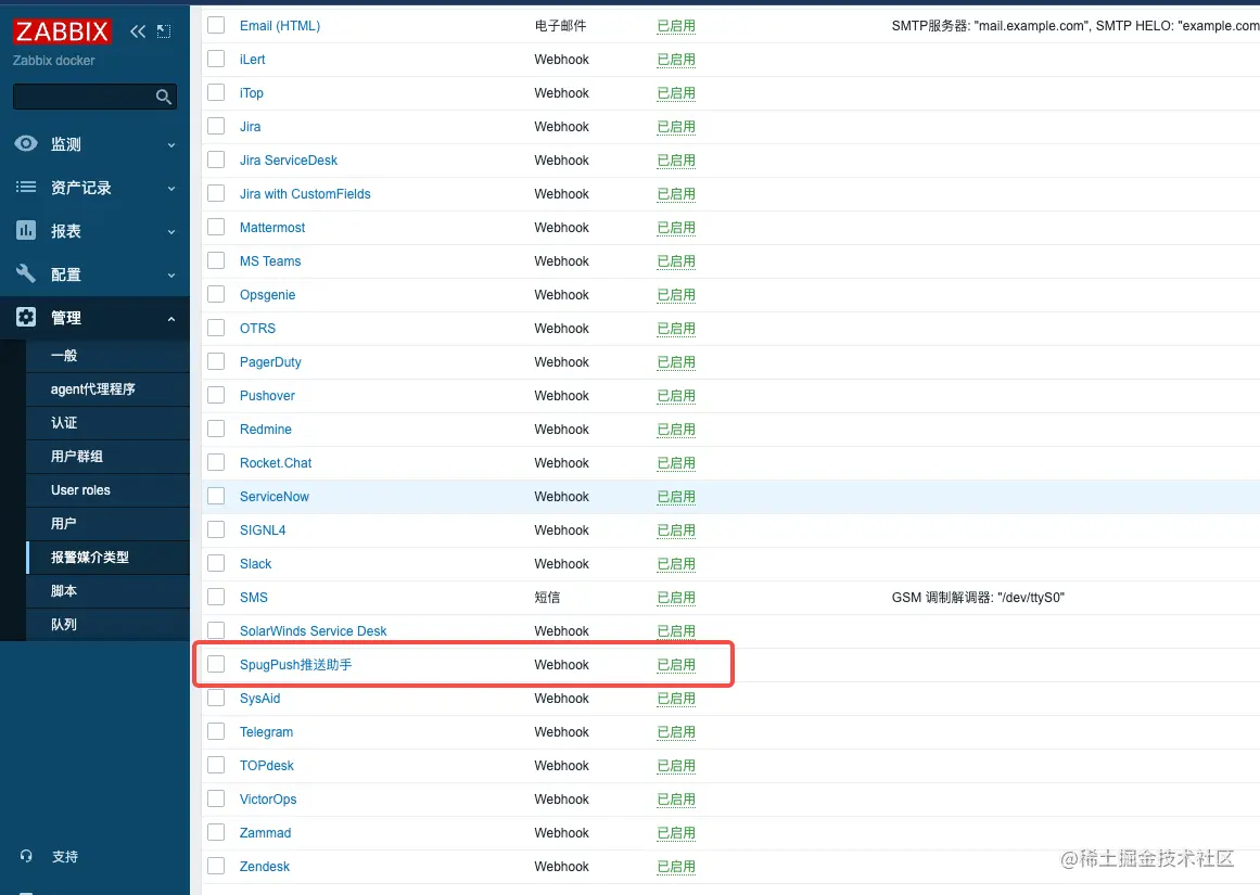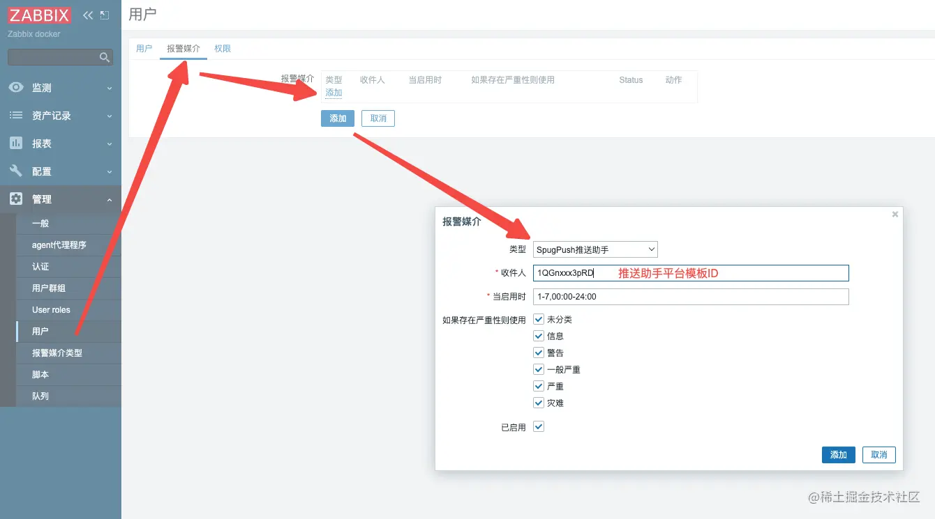 - 类型选择刚才导入的报警媒介:SpugPush推送助手