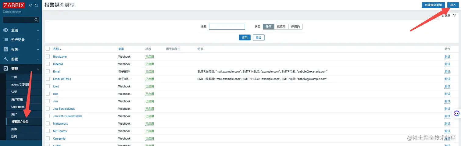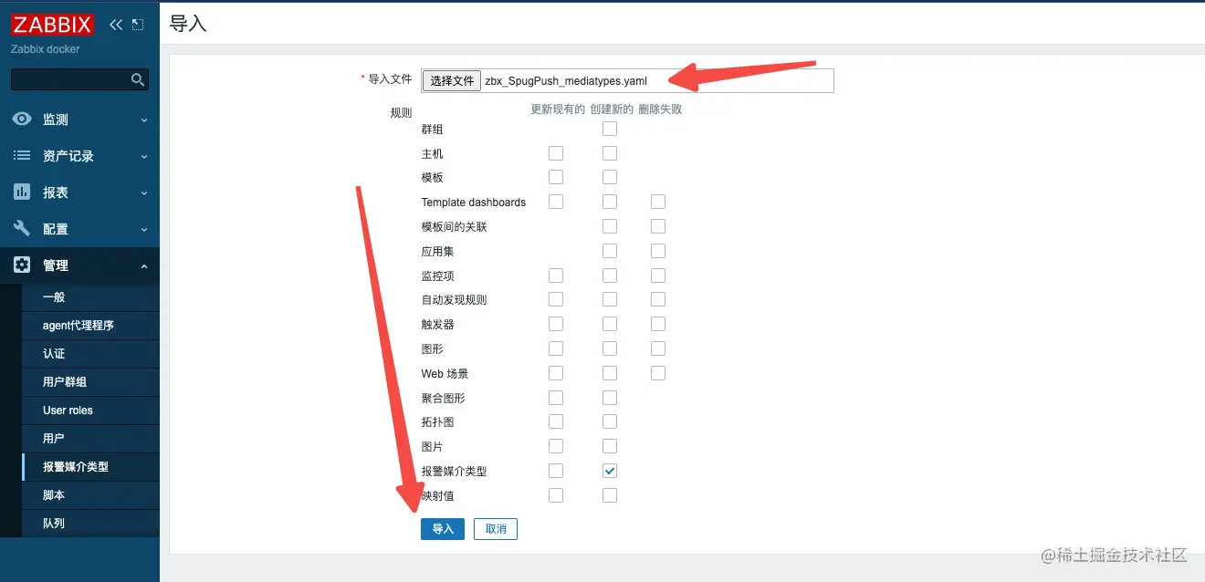 在Zabbix管理界面,依次点击左侧 管理 / 报警媒介类型 / 点击右上角的“导入”按钮,选择刚才下载的zbx_SpugPush_mediatypes.yaml文件,导入报警媒介