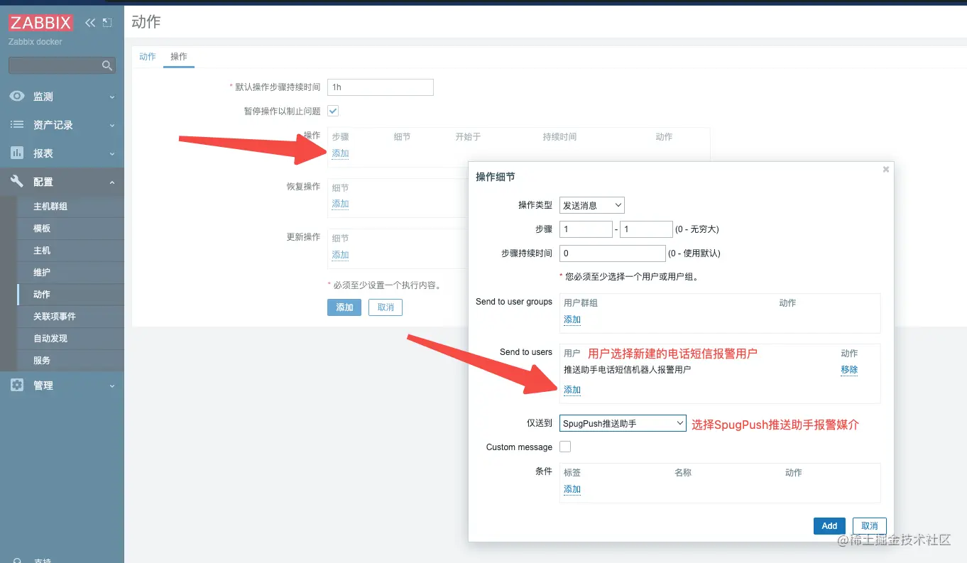 报警恢复操作:报警用户选择前面创建的电话短信机器人报警用户,发送渠道选择SpugPush推送助手