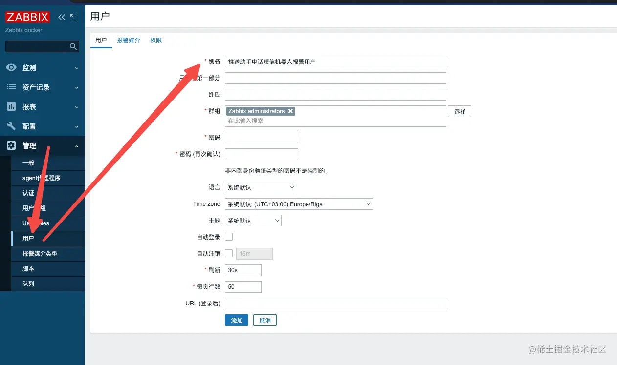 1、在Zabbix管理界面,依次点击左侧 管理 / 用户 / 创建用户