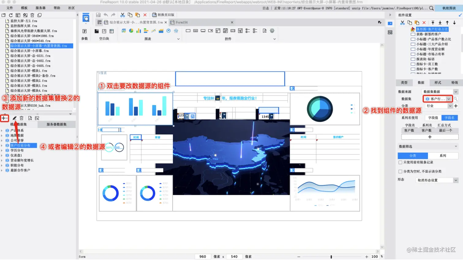对于通过复用的方式制作好的大屏模板,我们需要经历更换数据源、调整图表样式、调整所有组件、补充特效4个步骤。